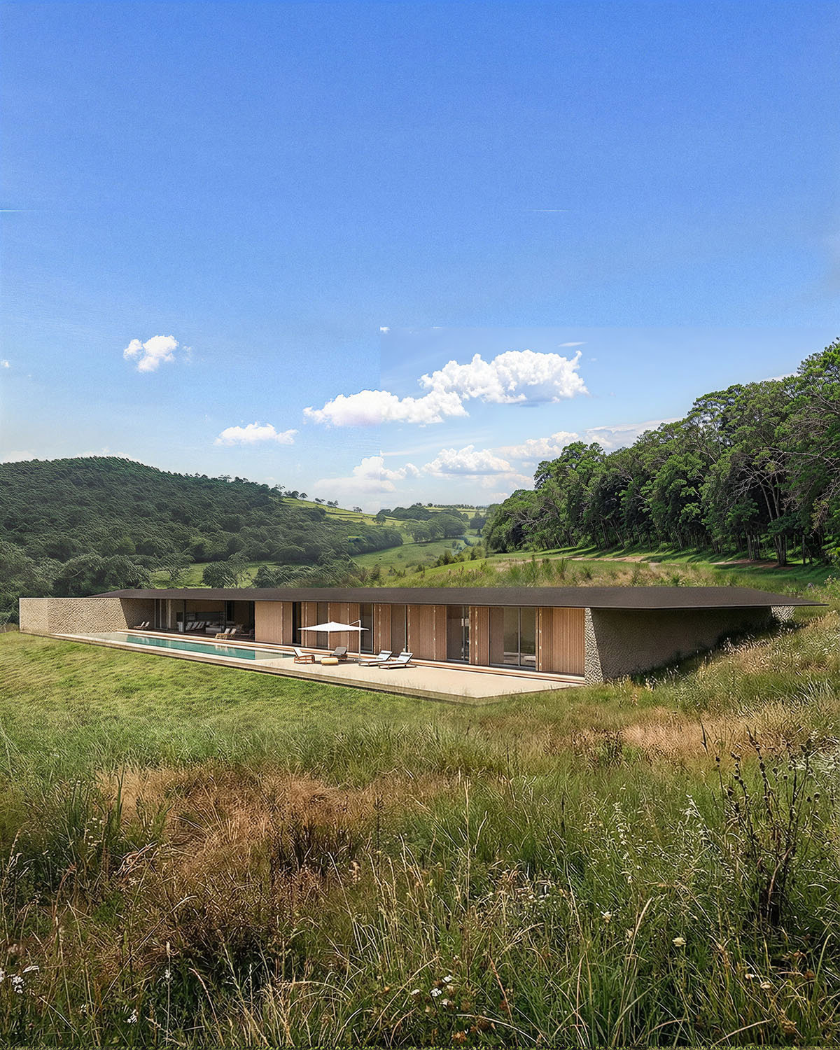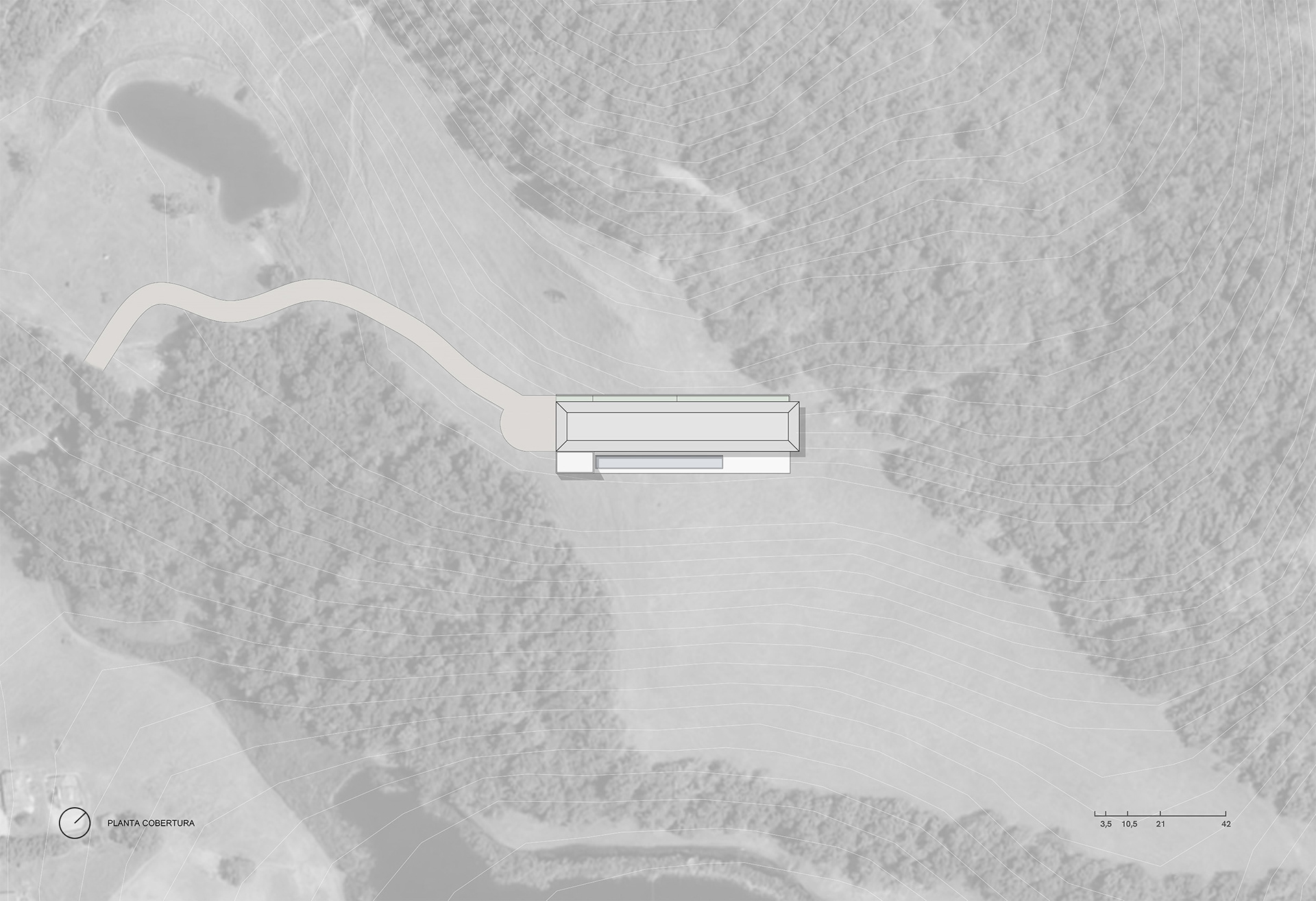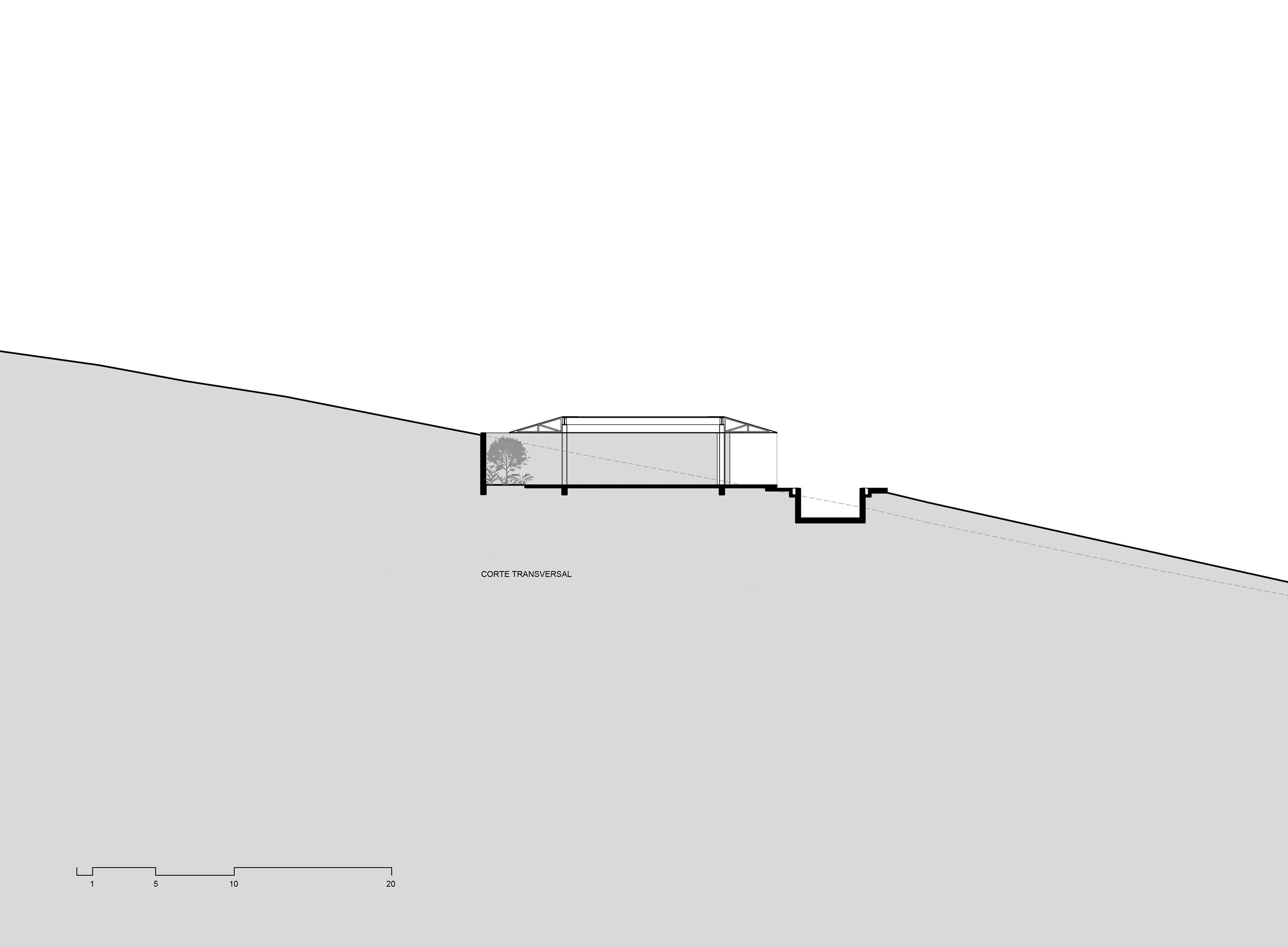 Com uma implantação silenciosa, a volumetria da casa é discreta e não compete com a paisagem. Na face noroeste encontra-se um grande muro de arrimo revestido de pedra que libera a cota de implantação. Junto ao muro temos uma faixa verde de jardim em grande parte do seu perímetro. Assim como a natureza é a anfitriã de quem chega ao terreno, o jardim recebe e guia o pedestre para um passeio que aos poucos revela a área social da casa voltada para a paisagem.