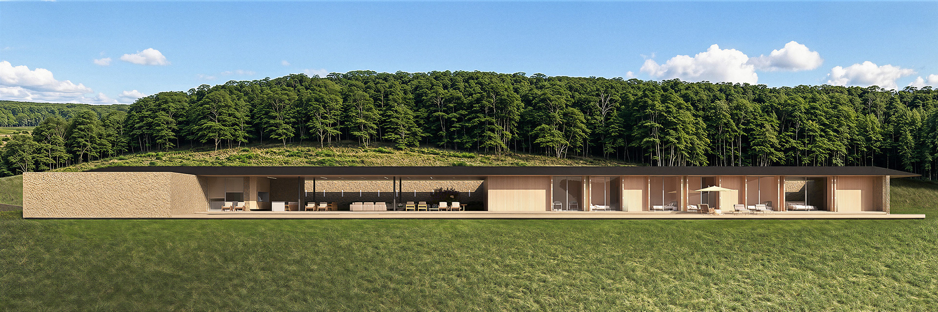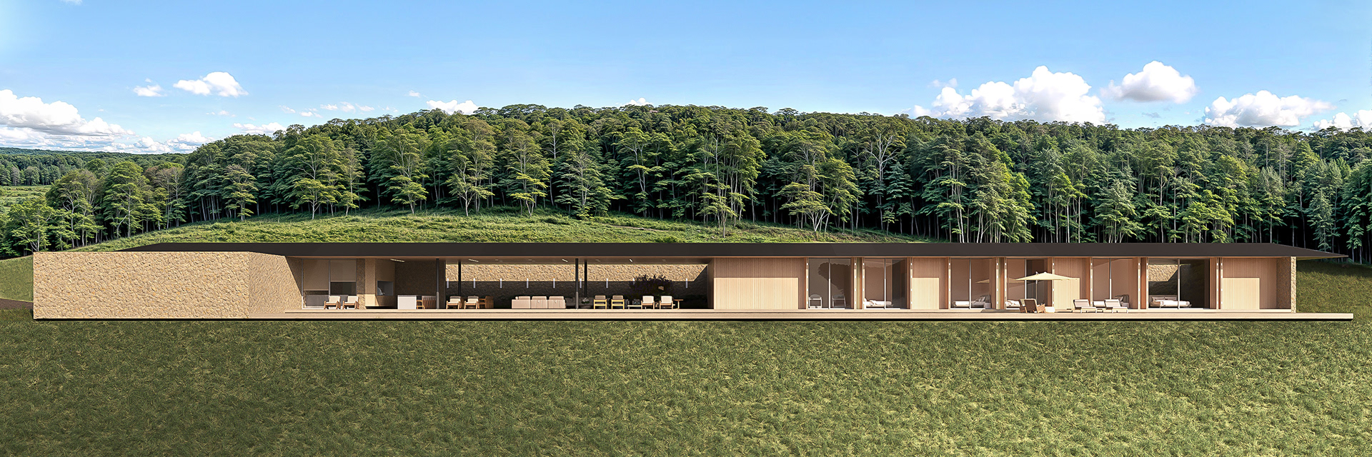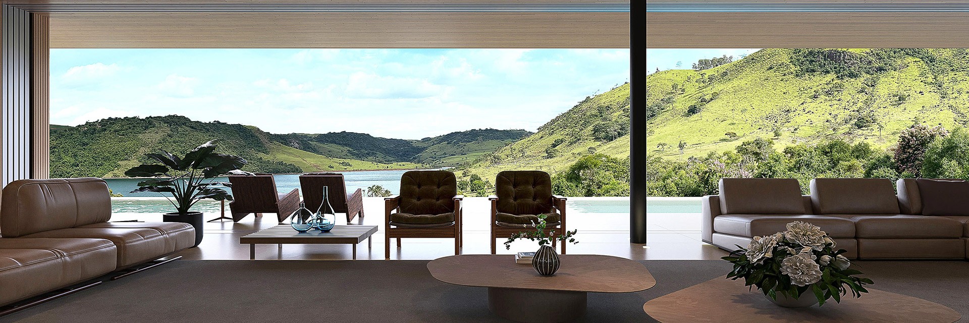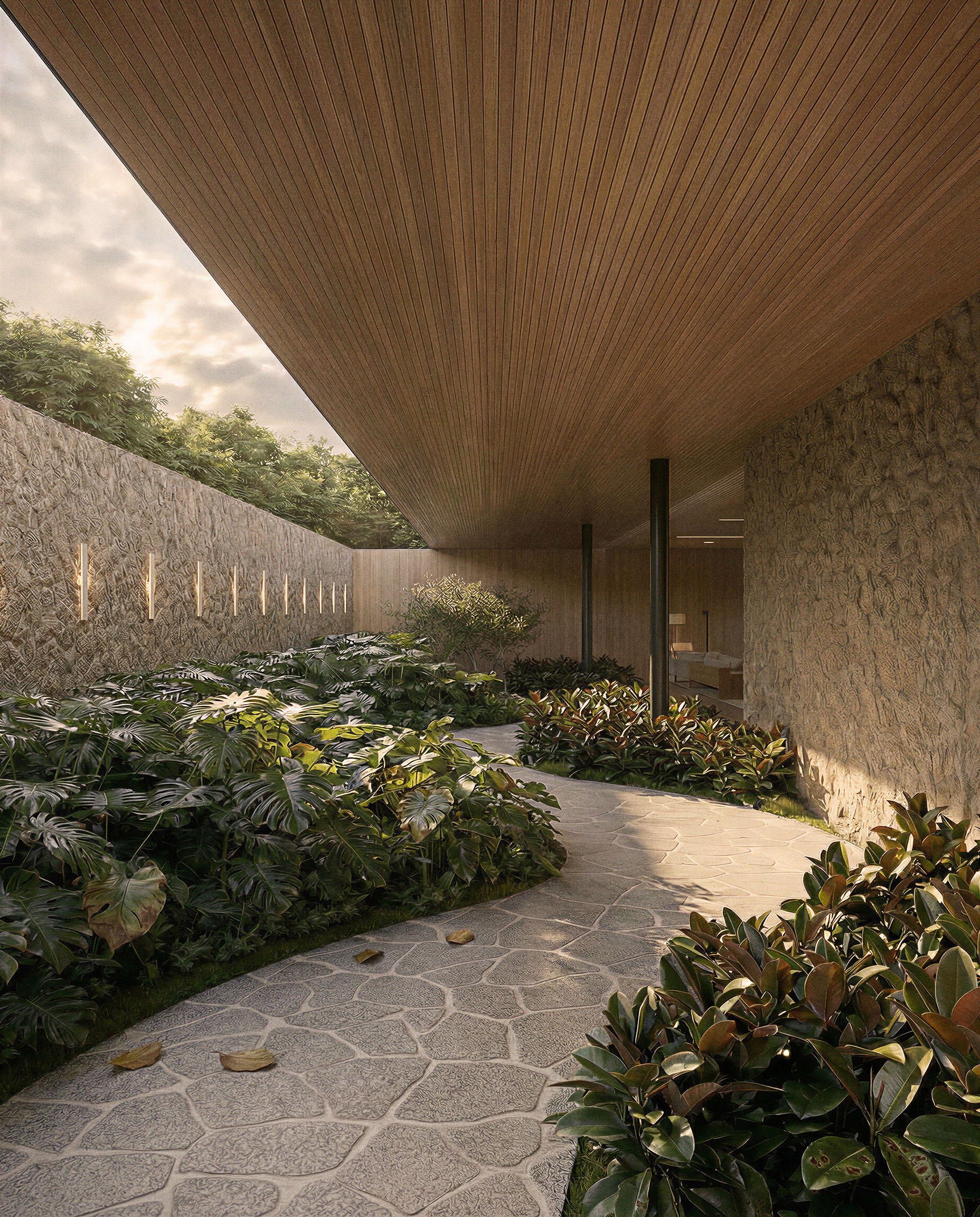 Com uma implantação silenciosa, a volumetria da casa é discreta e não compete com a paisagem. Na face noroeste encontra-se um grande muro de arrimo revestido de pedra que libera a cota de implantação. Junto ao muro temos uma faixa verde de jardim em grande parte do seu perímetro. Assim como a natureza é a anfitriã de quem chega ao terreno, o jardim recebe e guia o pedestre para um passeio que aos poucos revela a área social da casa voltada para a paisagem.