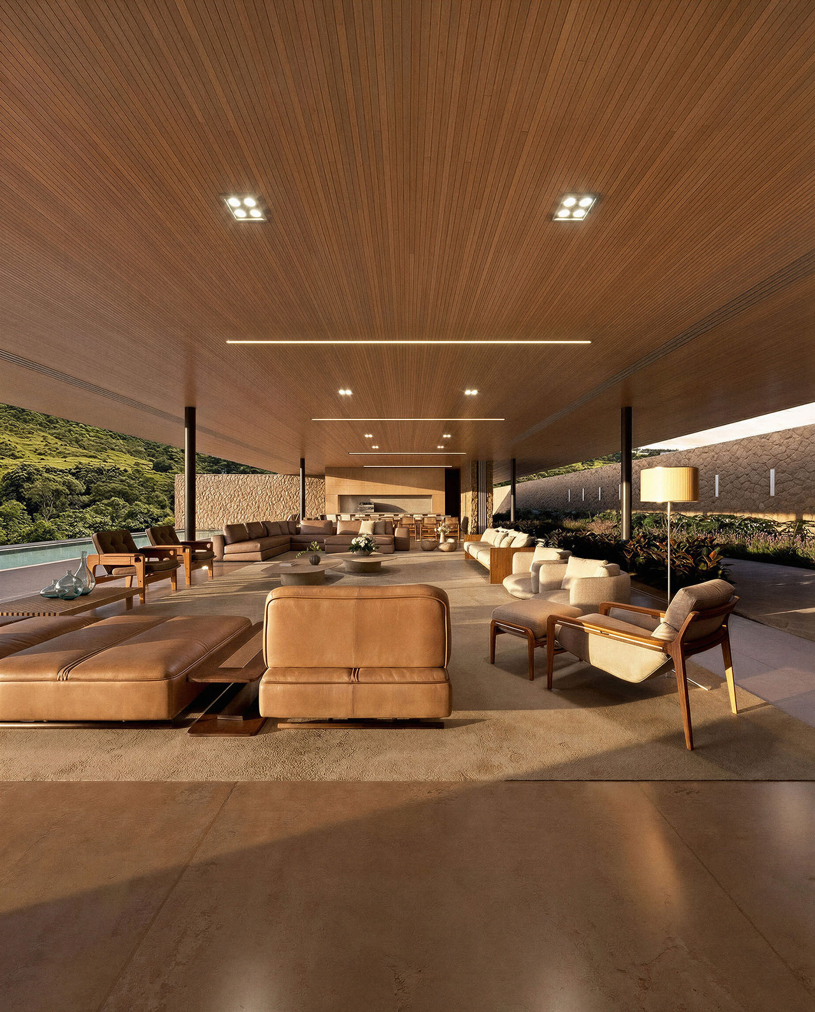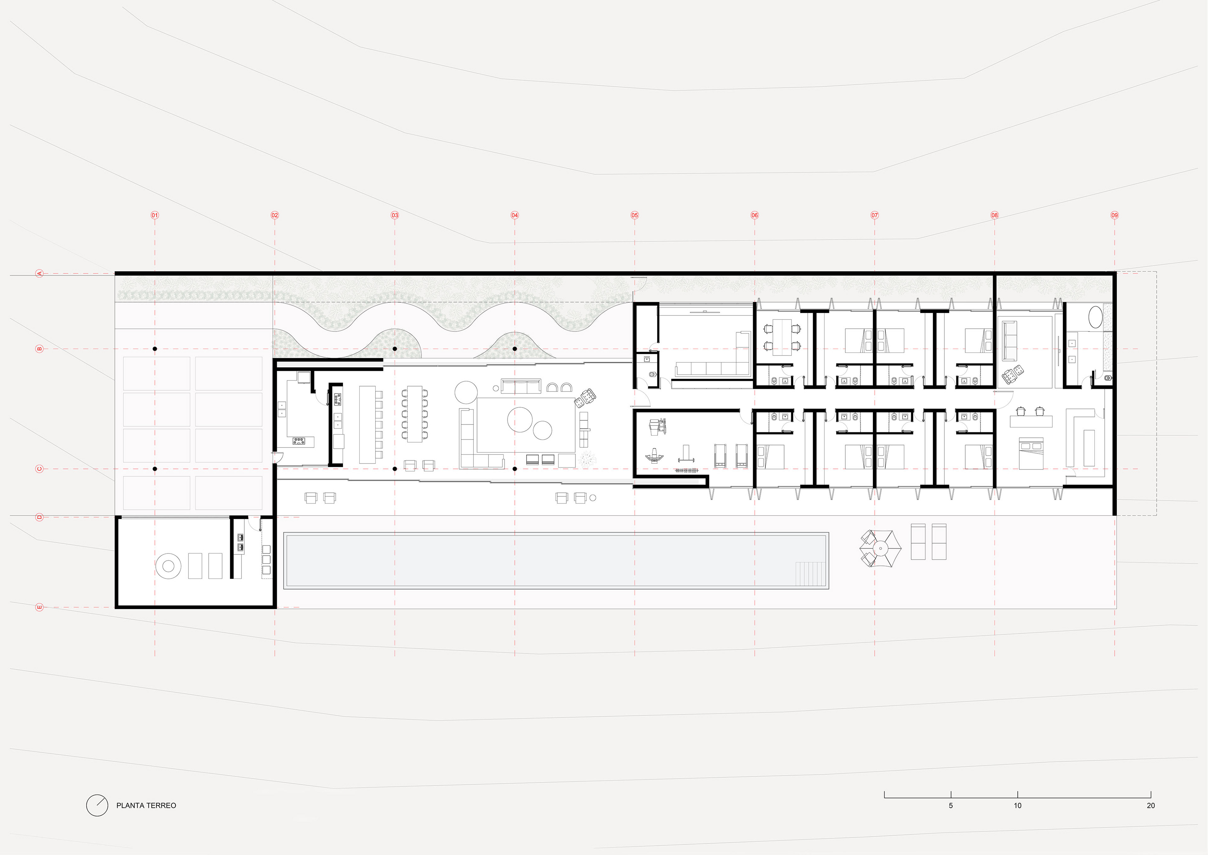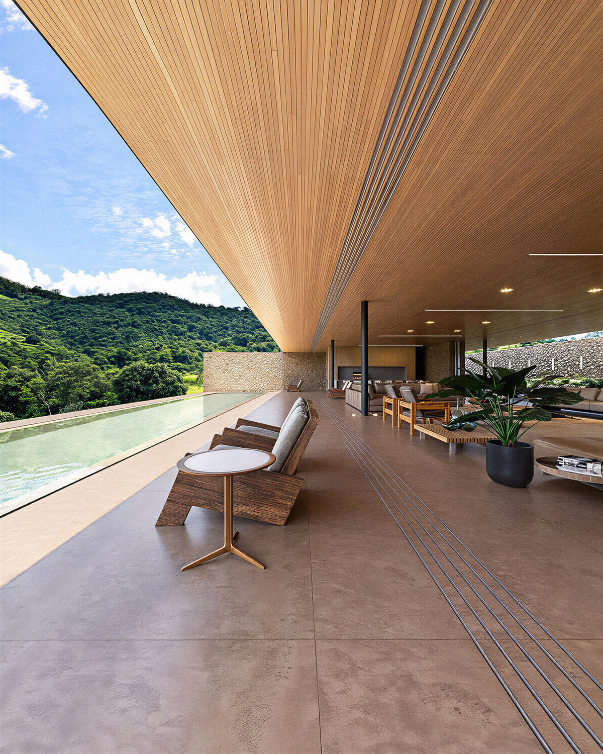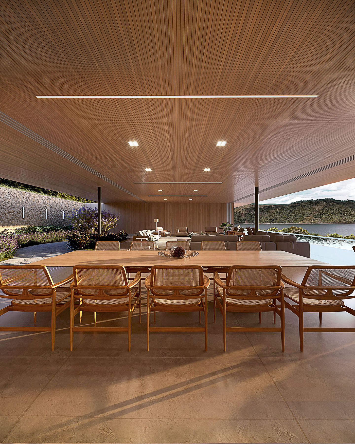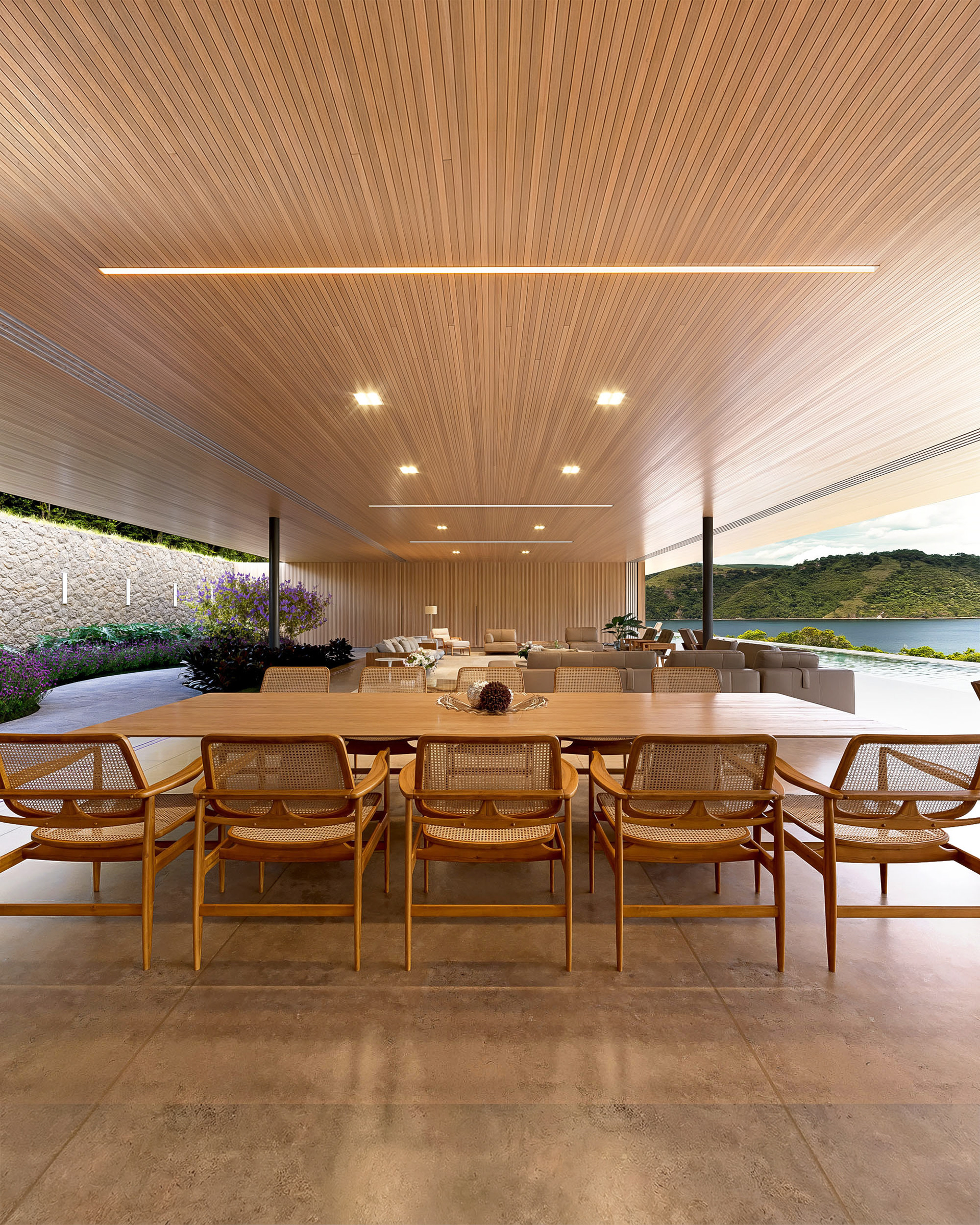 A cobertura da casa em estrutura metálica se afasta 2 metros em relação ao muro de arrimo, o que permite ventilação cruzada em toda a área social. A piscina com um comprimento generoso de 40 metros se estende pela laje externa da face sudeste. Cinco suítes se voltam para sudeste, enquanto as outras três se abrem para noroeste.