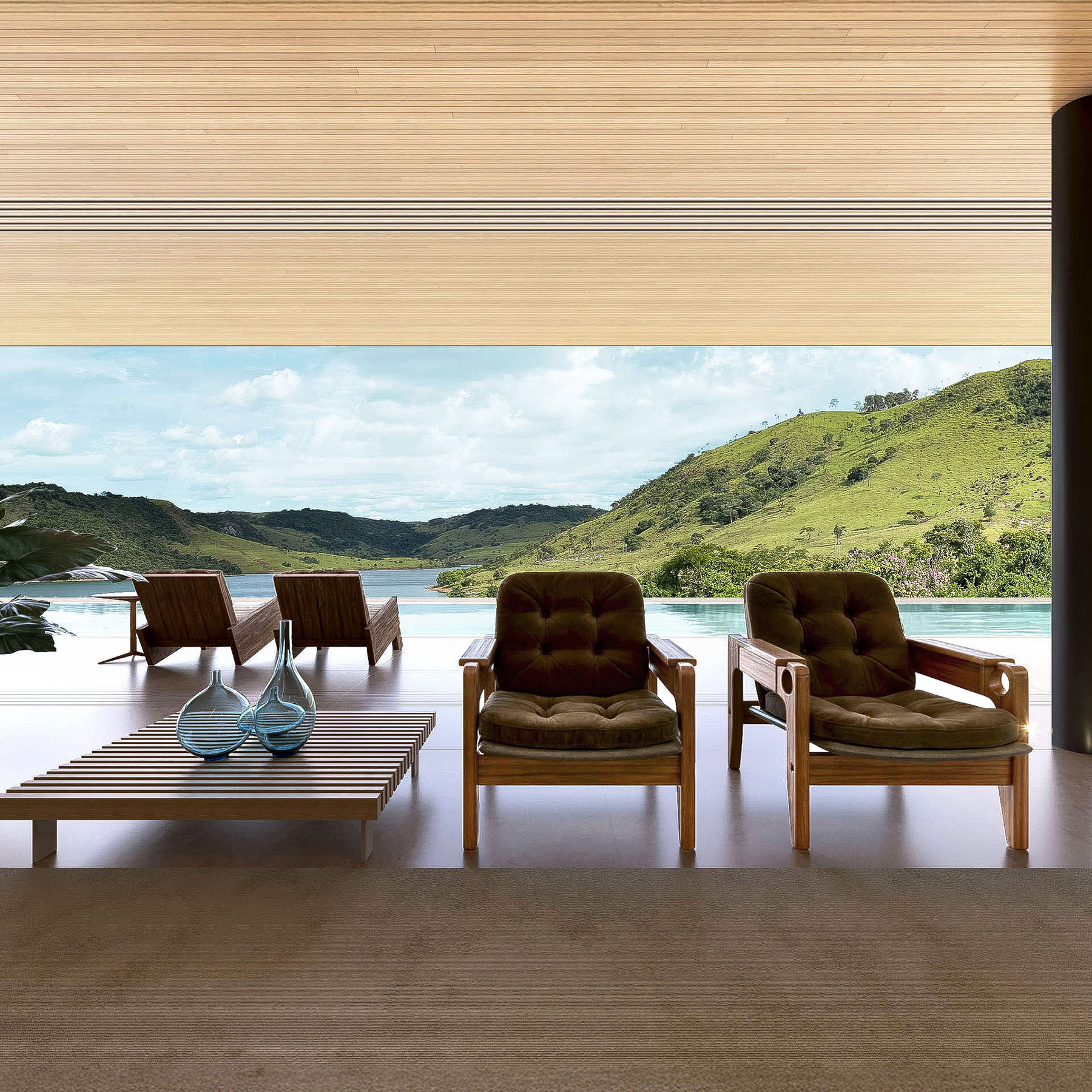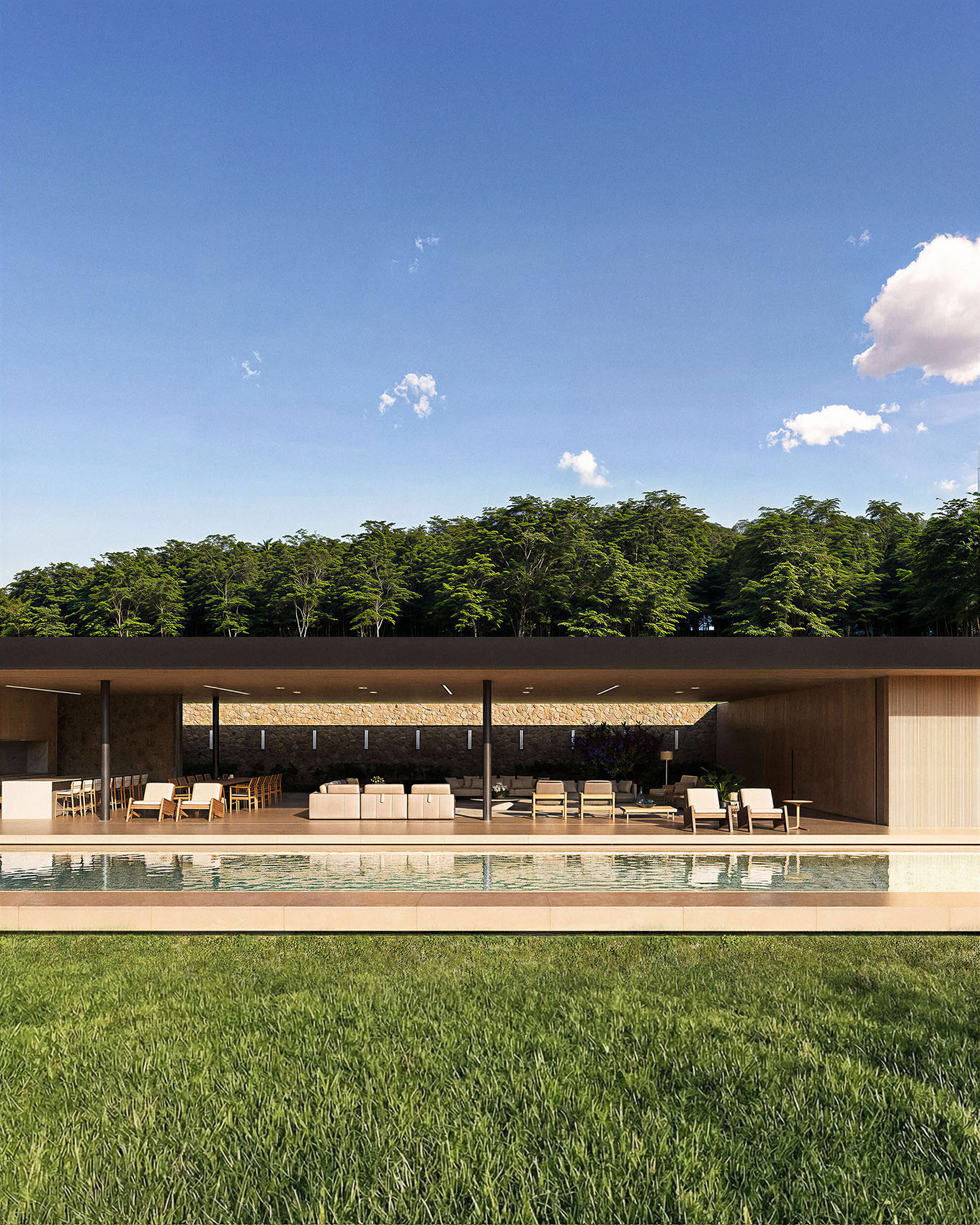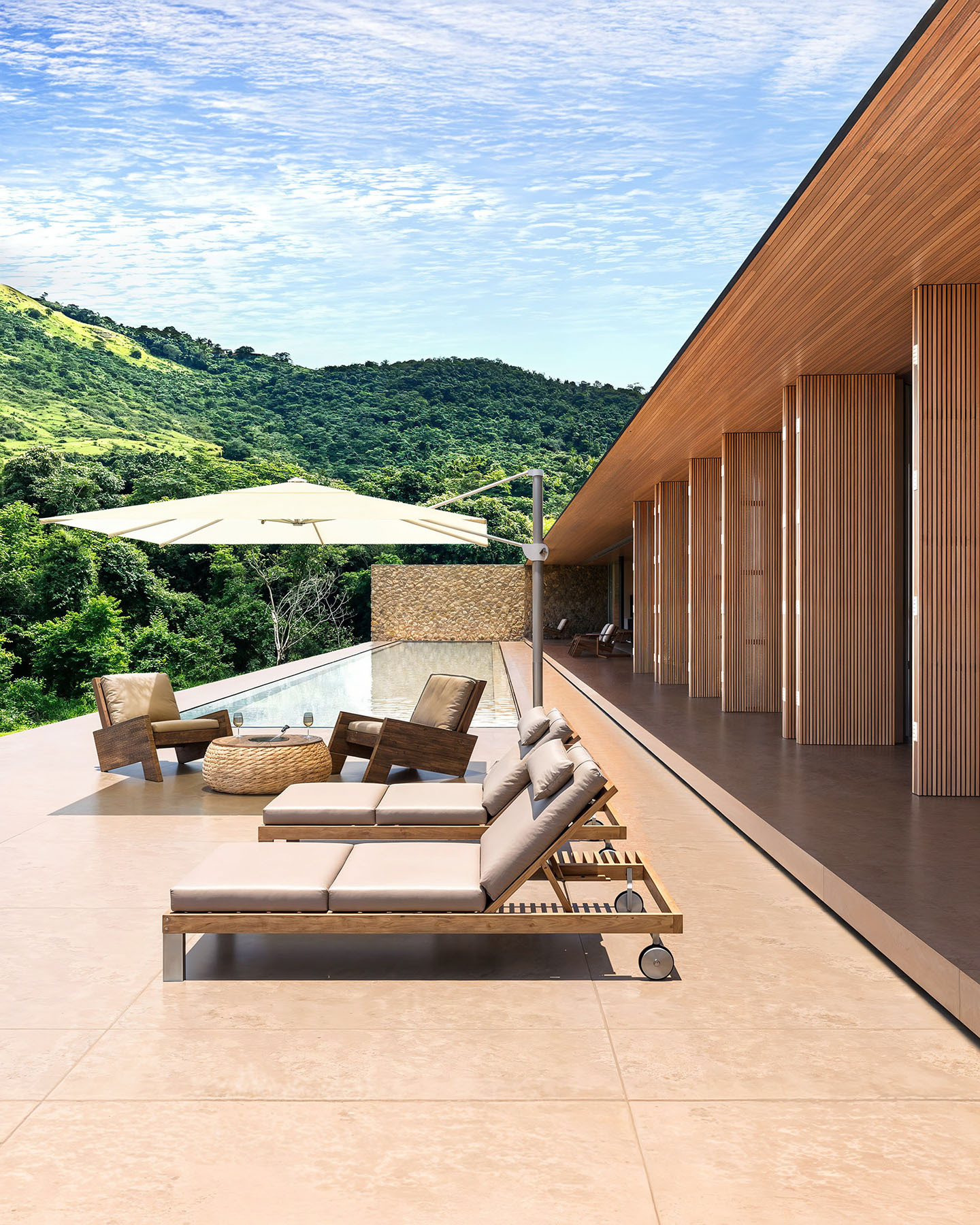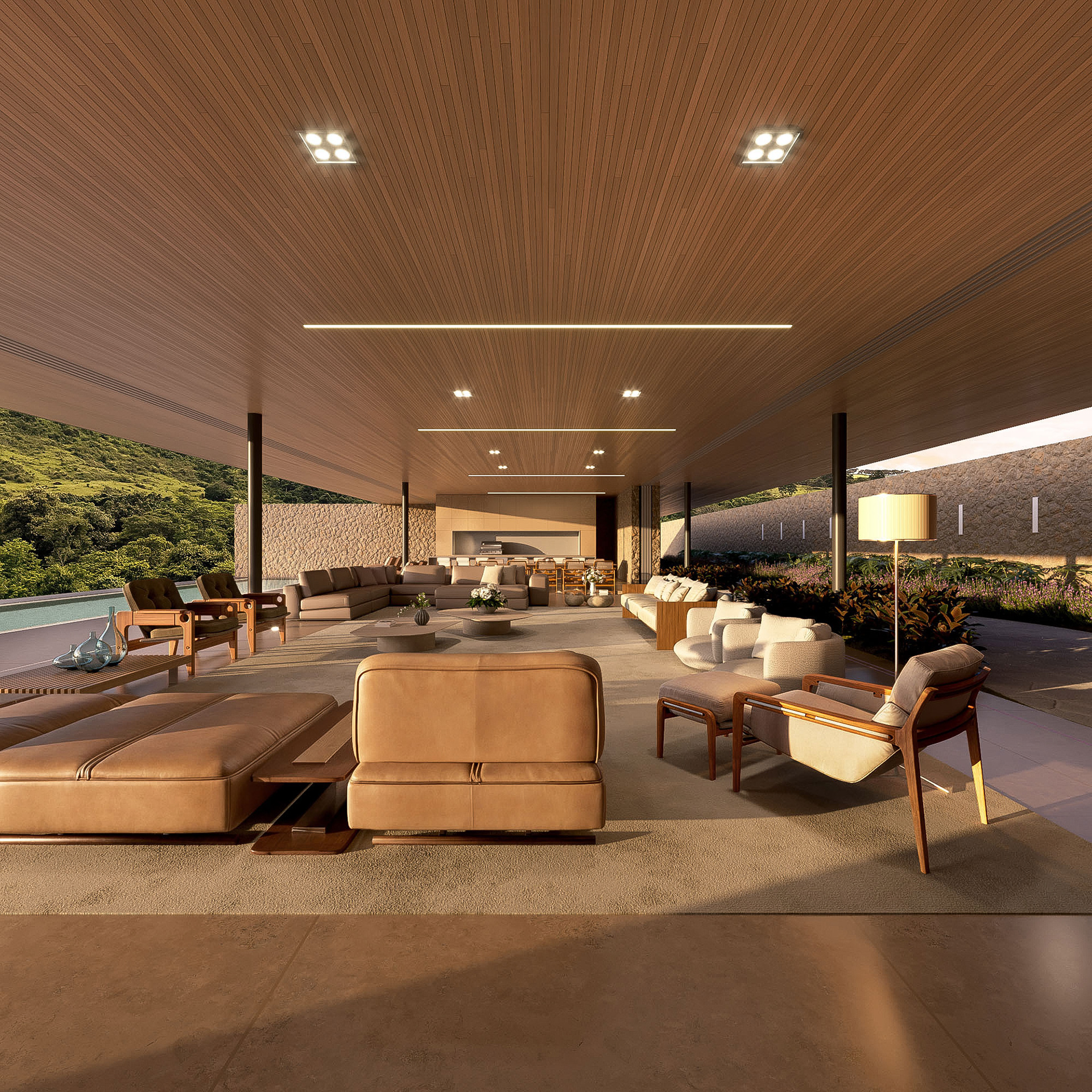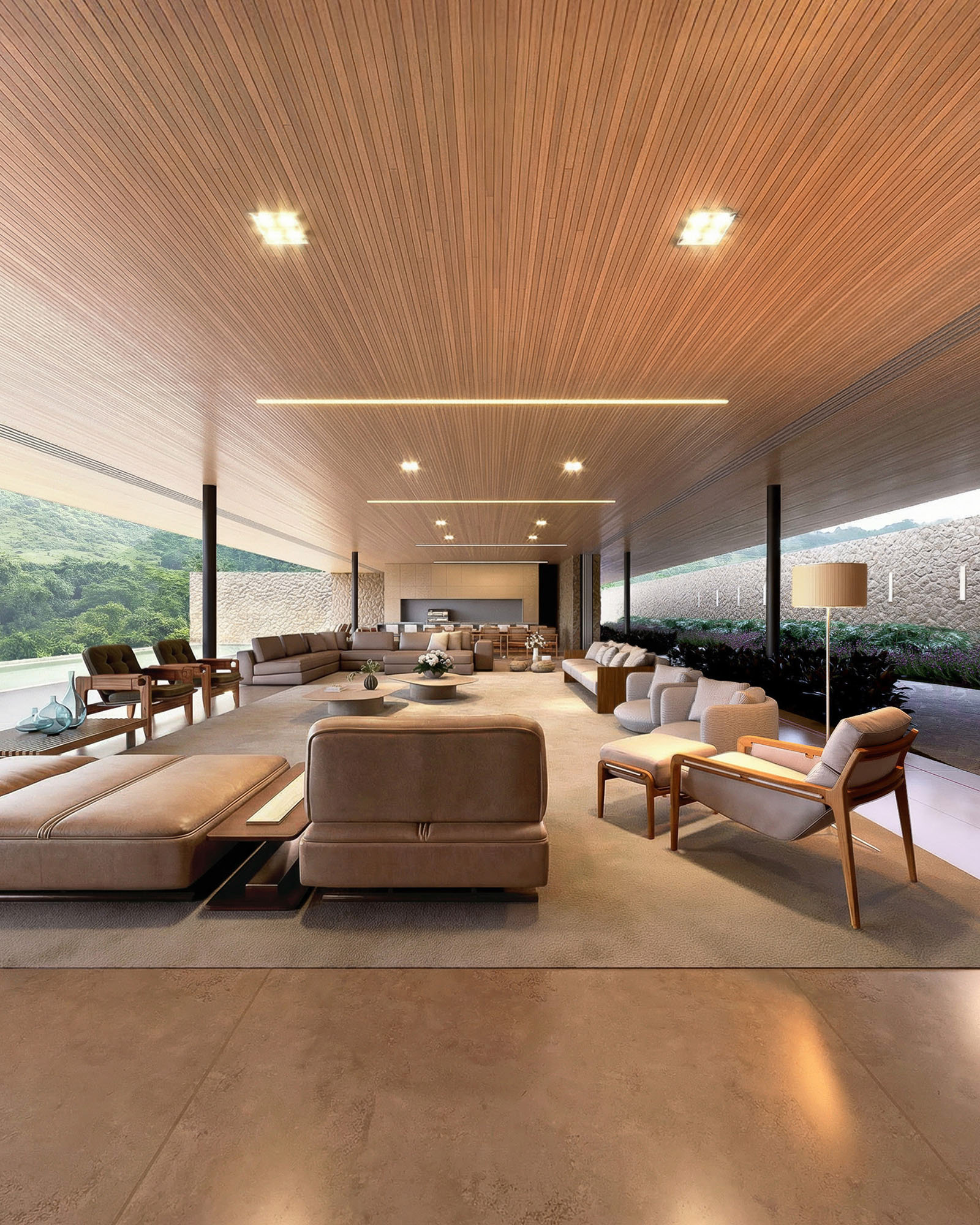 A cobertura da casa em estrutura metálica se afasta 2 metros em relação ao muro de arrimo, o que permite ventilação cruzada em toda a área social. A piscina com um comprimento generoso de 40 metros se estende pela laje externa da face sudeste. Cinco suítes se voltam para sudeste, enquanto as outras três se abrem para noroeste.